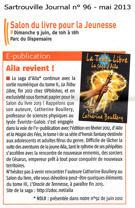 Le journal de Sartrouville, numéro 96 de mai 2013 annonce l'événement avec un encart consacré à l'auteure de fantasy