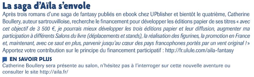Le journal de Sartrouville, numéro 102 de juin 2014 relaie la campagne de financement participatif (crowdfunding) lancée par l'auteure de fantasy sur la plateforme Ulule